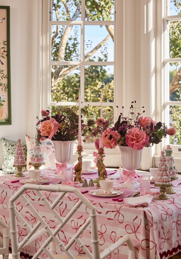 I portacandele Dahlia e il vaso Odette Grecian Fluted aggiungono una nota di elegante sobrietà per bilanciare la palette zuccherosa, mentre le esclusive tovagliette rosa Casa by JJ con dettagli bianchi e fiocchi di velluto rosa completano il look con il fascino caratteristico del marchio.