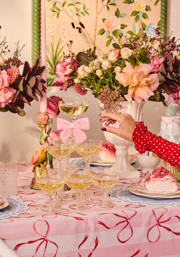 I portacandele Dahlia e il vaso Odette Grecian Fluted aggiungono una nota di elegante sobrietà per bilanciare la palette zuccherosa, mentre le esclusive tovagliette rosa Casa by JJ con dettagli bianchi e fiocchi di velluto rosa completano il look con il fascino caratteristico del marchio.