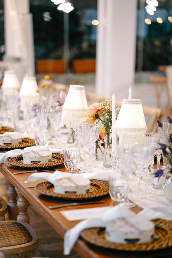 I fiori, vibranti e colorati, richiamavano le origini della sposa, ma si fondevano armoniosamente con la rusticità elegante della masseria. I runner realizzati a mano e i candelieri diffondevano una luce calda, creando un equilibrio perfetto tra autenticità e raffinatezza.